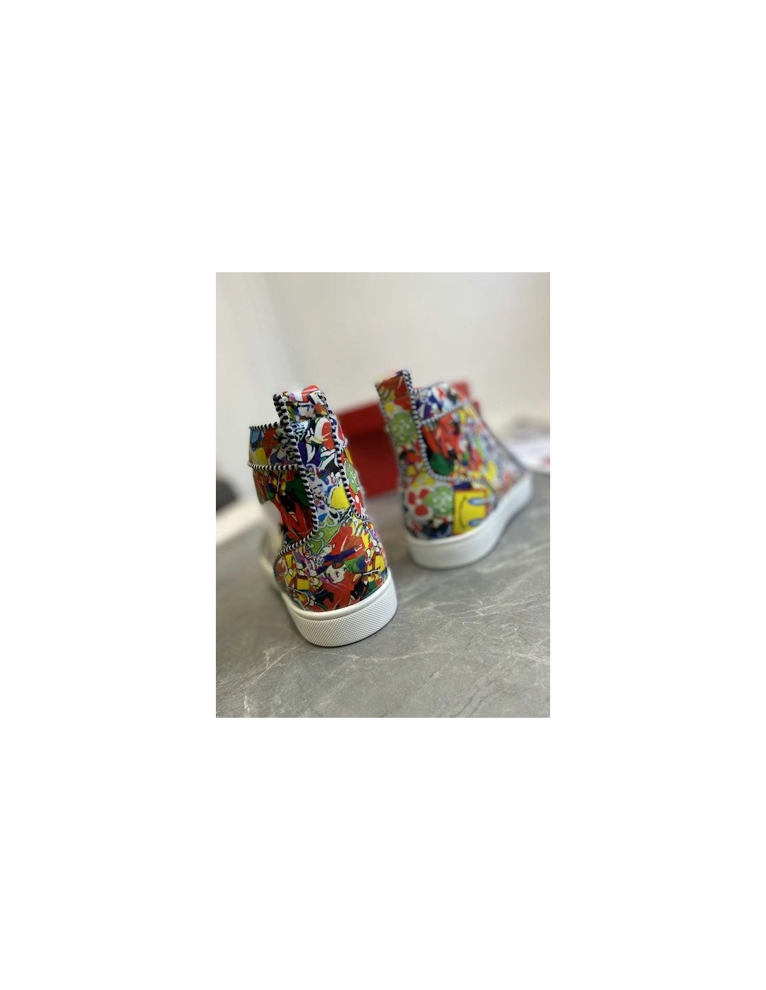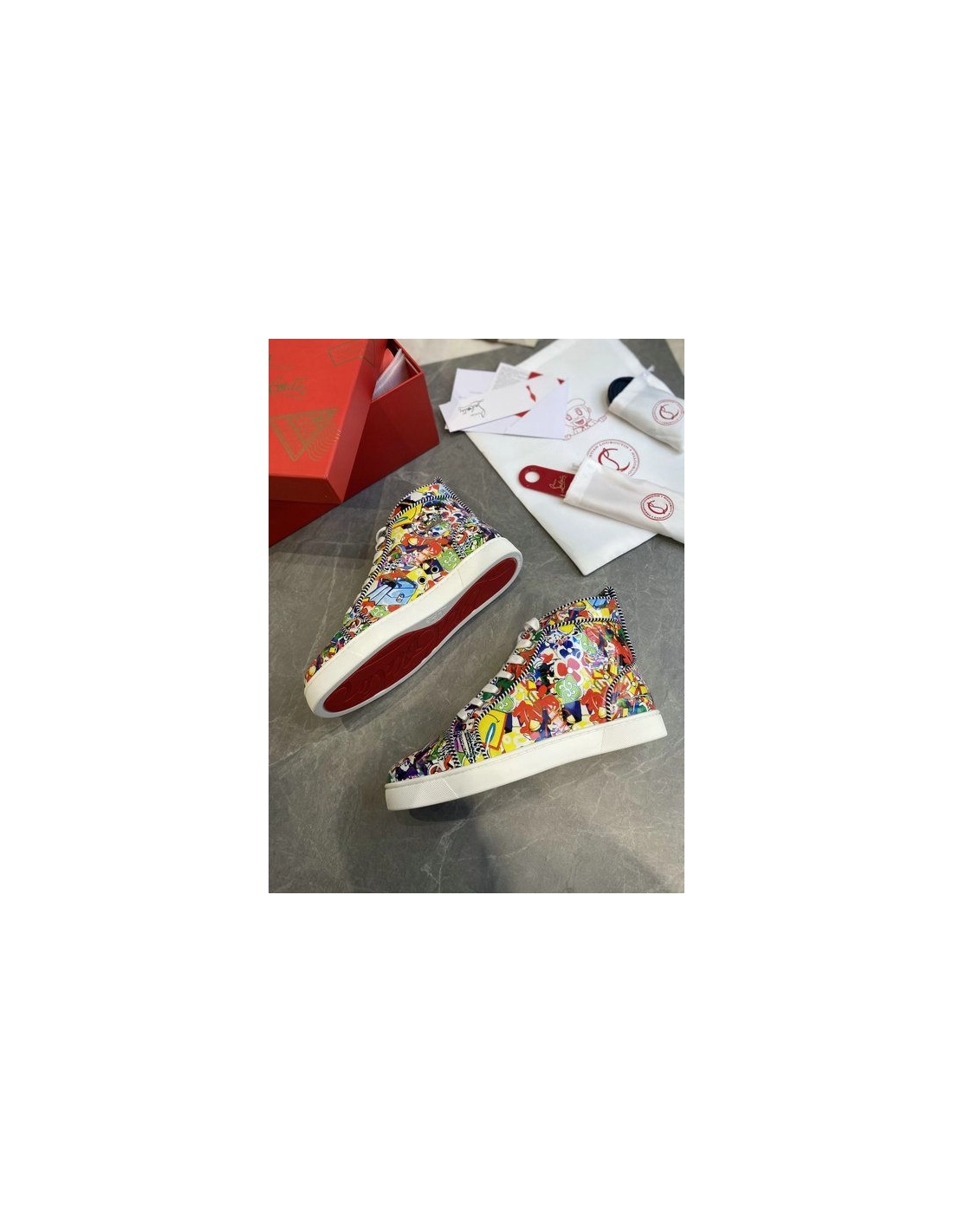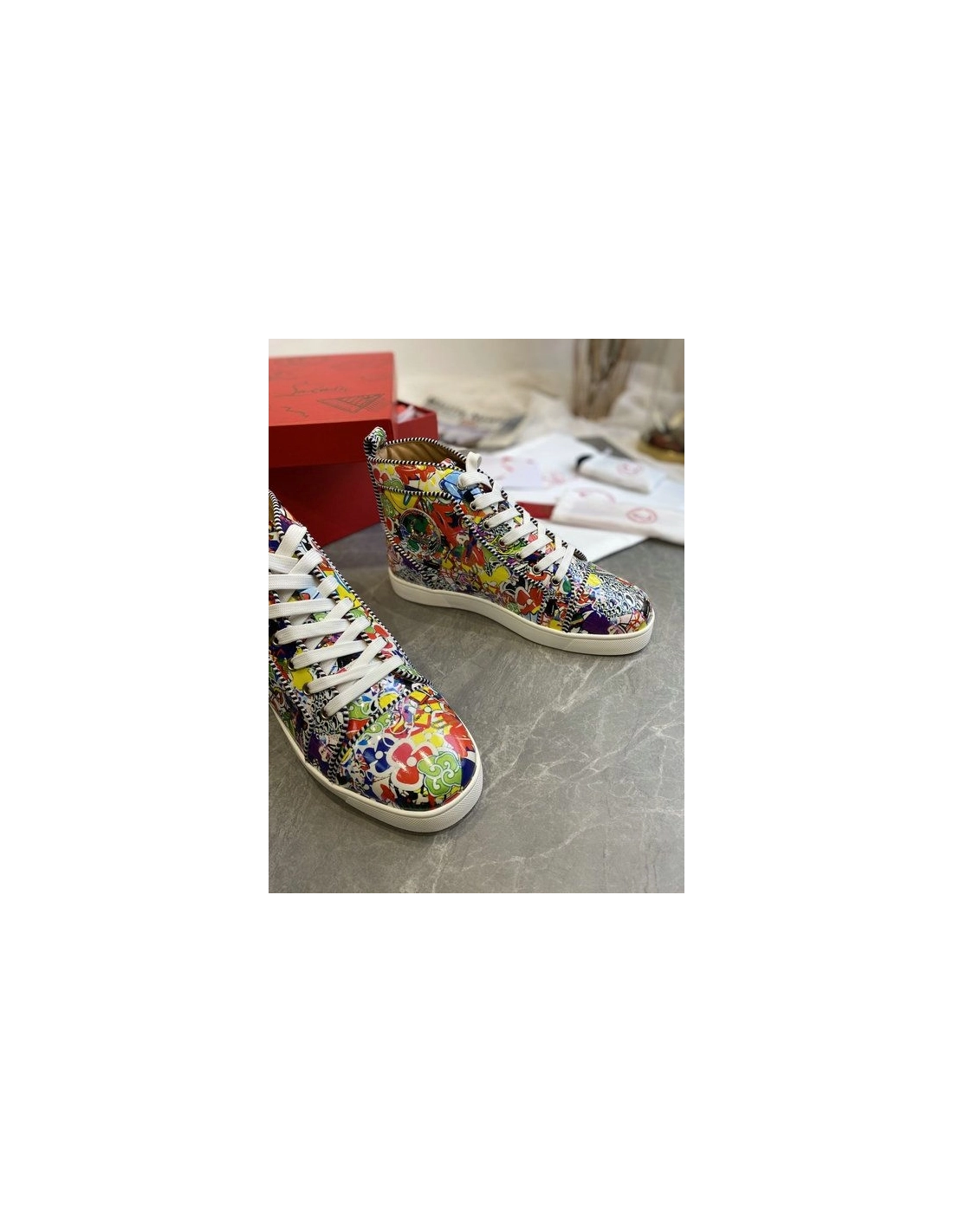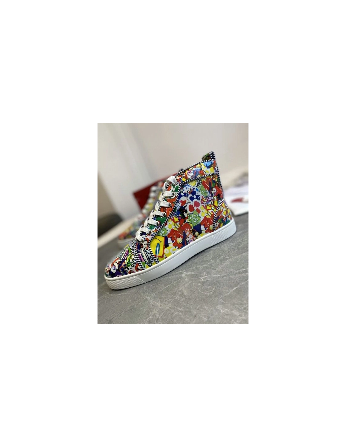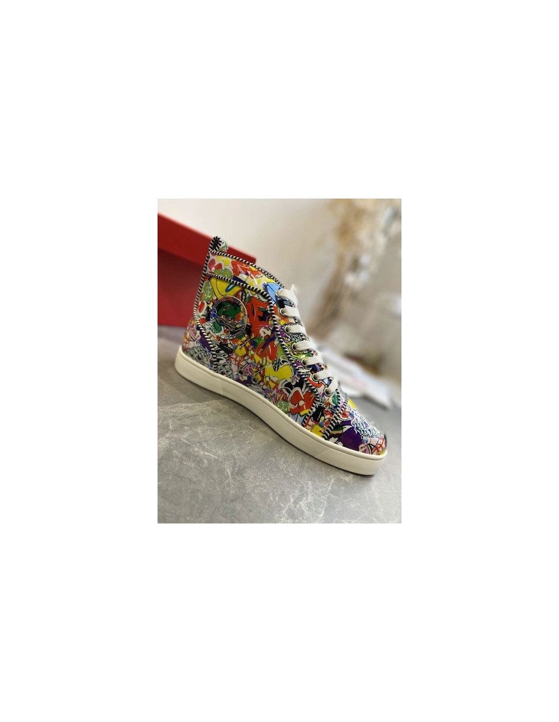 Christian Louboutin Louis Orlato High-top Sneakers Leather Graffiti Imagery Multicolor offer a vivid introduction into the extravagant world of Louboutin, this pair's smooth leather is painted with the exclusive Super Loubi print in a vibrant palette of hues. These sneakers feature various colorful cartoon designs with a red and white rubber sole.