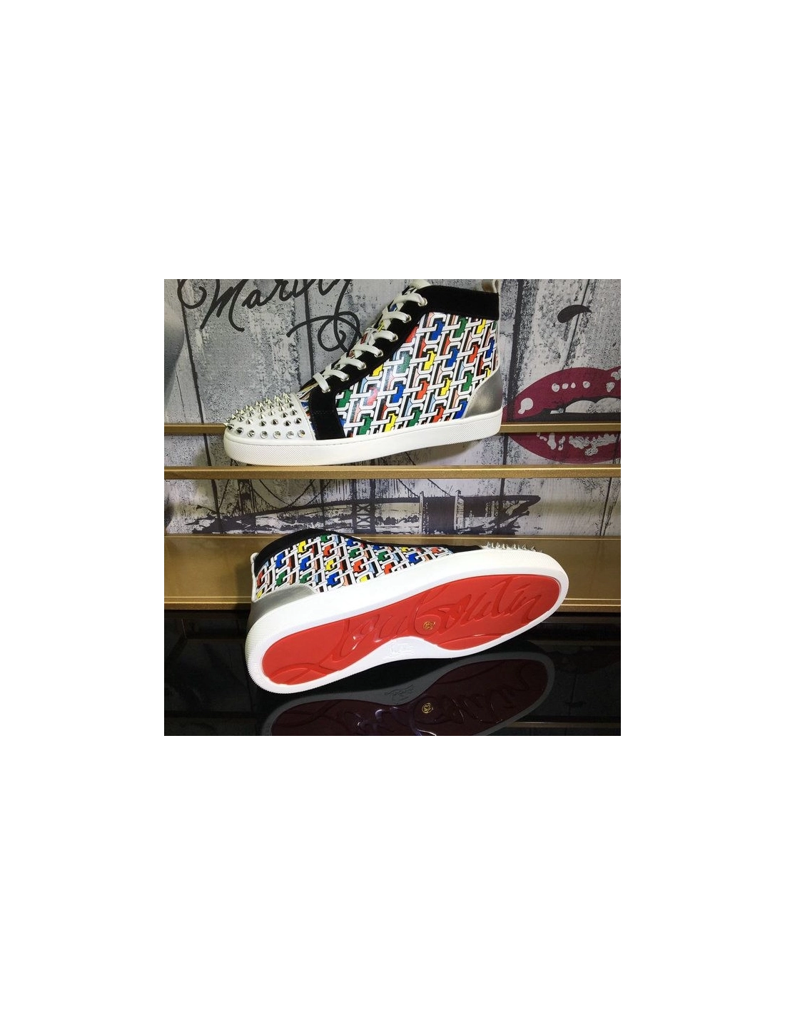 Christian Louboutin Lou Spike Orlato High-top Sneakers Cl Logo Multicolor are crafted from suede and calf leather, cloaked in an all over multicoloured motif that's scattered with fashion house's iconic initials in 3D form and sprinkled with a handful of spikes. They're finished with a lick of the signature hue at the sole.