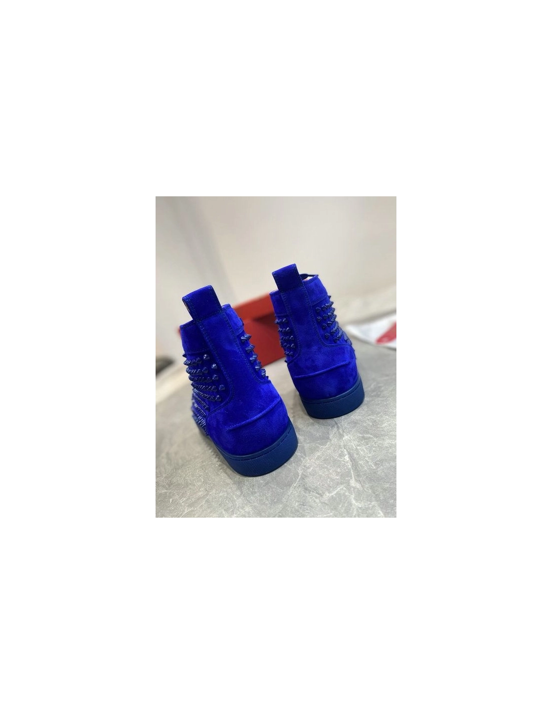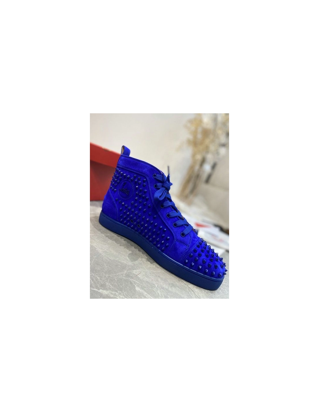 Christian Louboutin Louis Spikes High-Top Sneakers Veau Velous Klein Blue are crafted of blue suede leather, covered in matching blue cone studs. The sneakers feature a blue Louboutin logo at the instep, and red rubber soles. These are excellent sneakers for play and pleasure, with the iconic style of Christian Louboutin!
