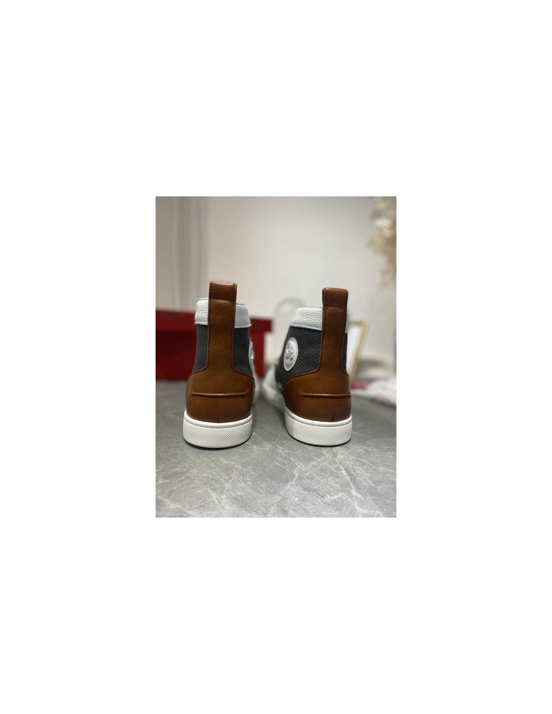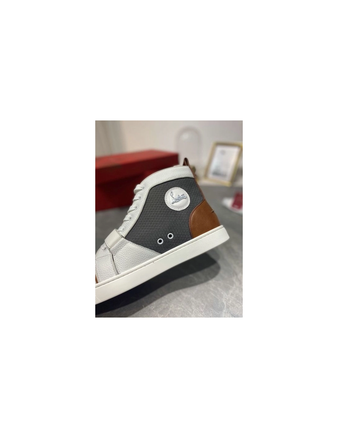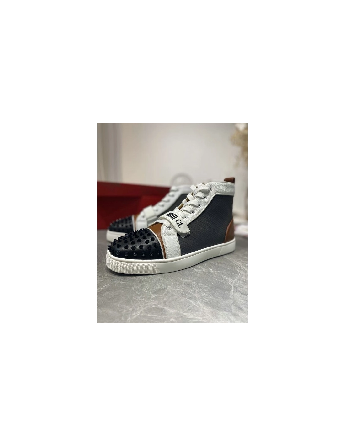 Christian Louboutin Lou Spike High Top Sneakers Calf Leather Multicolor offer a harmonious blend of style and comfort, perfect for those who demand sophistication in every step. Christian Louboutin reimagines the coveted Lou trainers in a striking grey panelled construction, offering a statement iteration. They're made in Italy from panels of white grained leather, grey rubber and black mesh that are layered with an embossed strap and gunmetal spikes, then finished with the signature red sole.