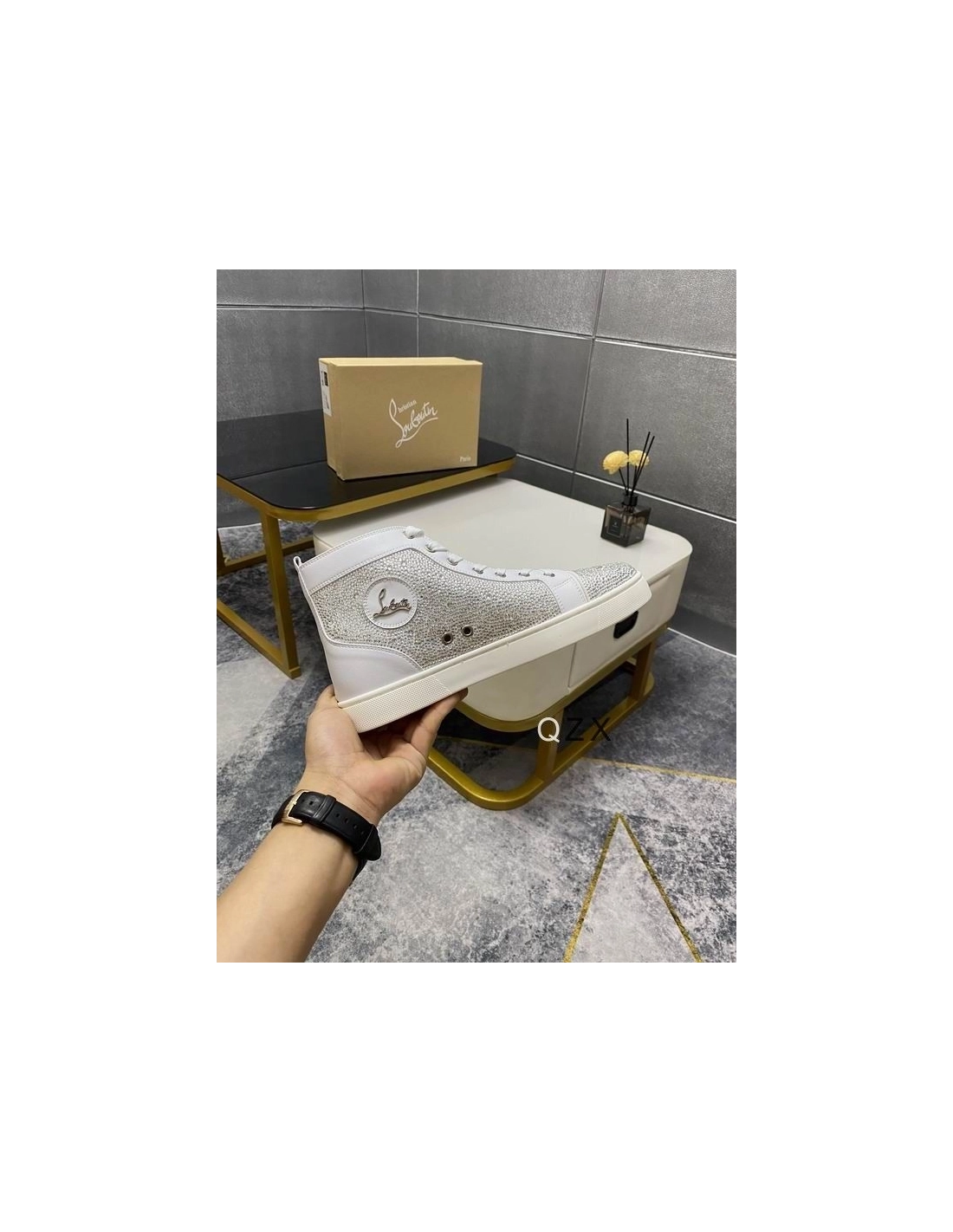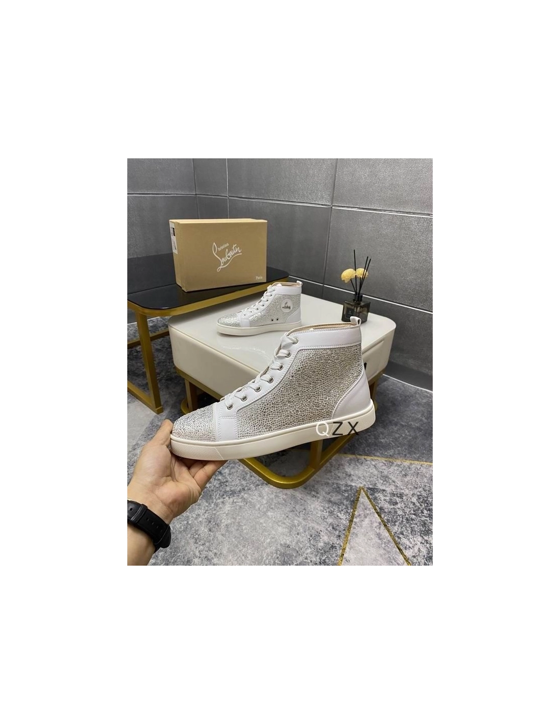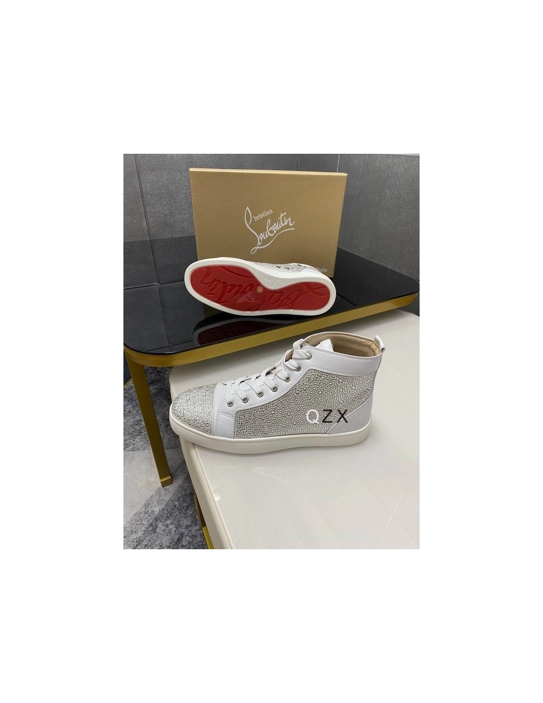 Christian Louboutin Louis Strass High-top Sneakers Calfskin White effortlessly blends retro chic with audacious modern elements. A master of reinvention, this sneaker takes on new textures and fabrics each season. This more classic model features with both calfskin leather and suede creating a stunning contrast. This sneaker is embellished with an array of shimmering strass.