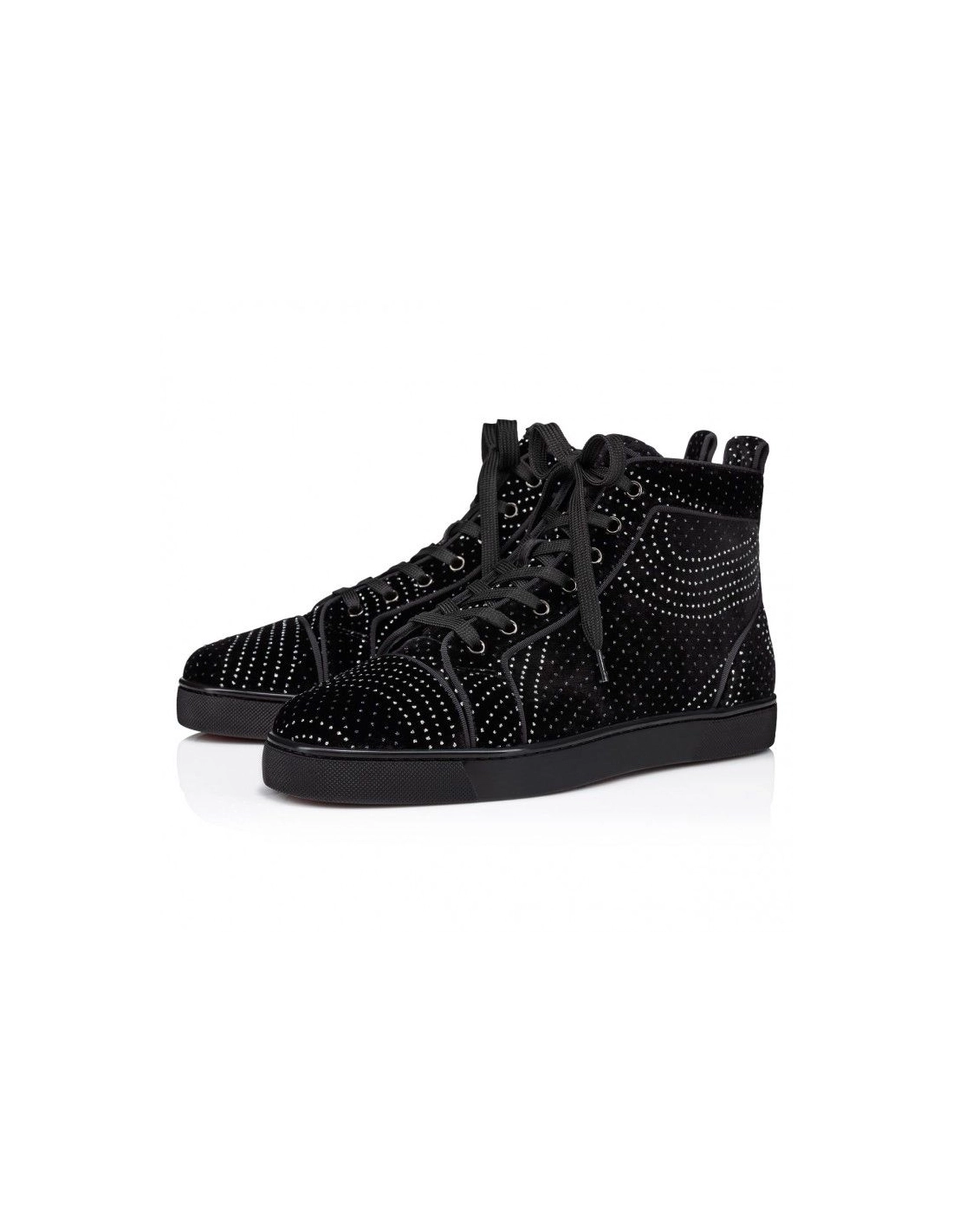 Replica Christian Louboutin Louis High-Top Sneakers Velvet River Calf Leather Black features a timeless appeal, evoking the basketball sneakers of the 1980s. This design showcases Maison Christian Louboutin's incredible textures and fabrics, and meticulous attention to detail. The upper on this sneaker is crafted in sophisticated black Velvet River fabric adorned with swirling patterns of silver dots. Outlining the dots, exquisite black grosgrain piping completes this striking sneaker.
