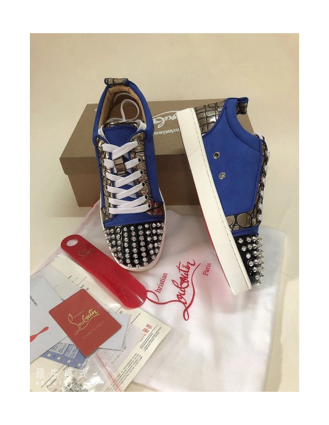 Christian Louboutin Louis Junior Spike Low Top Men Sneakers Leather and Veau Velours Blue