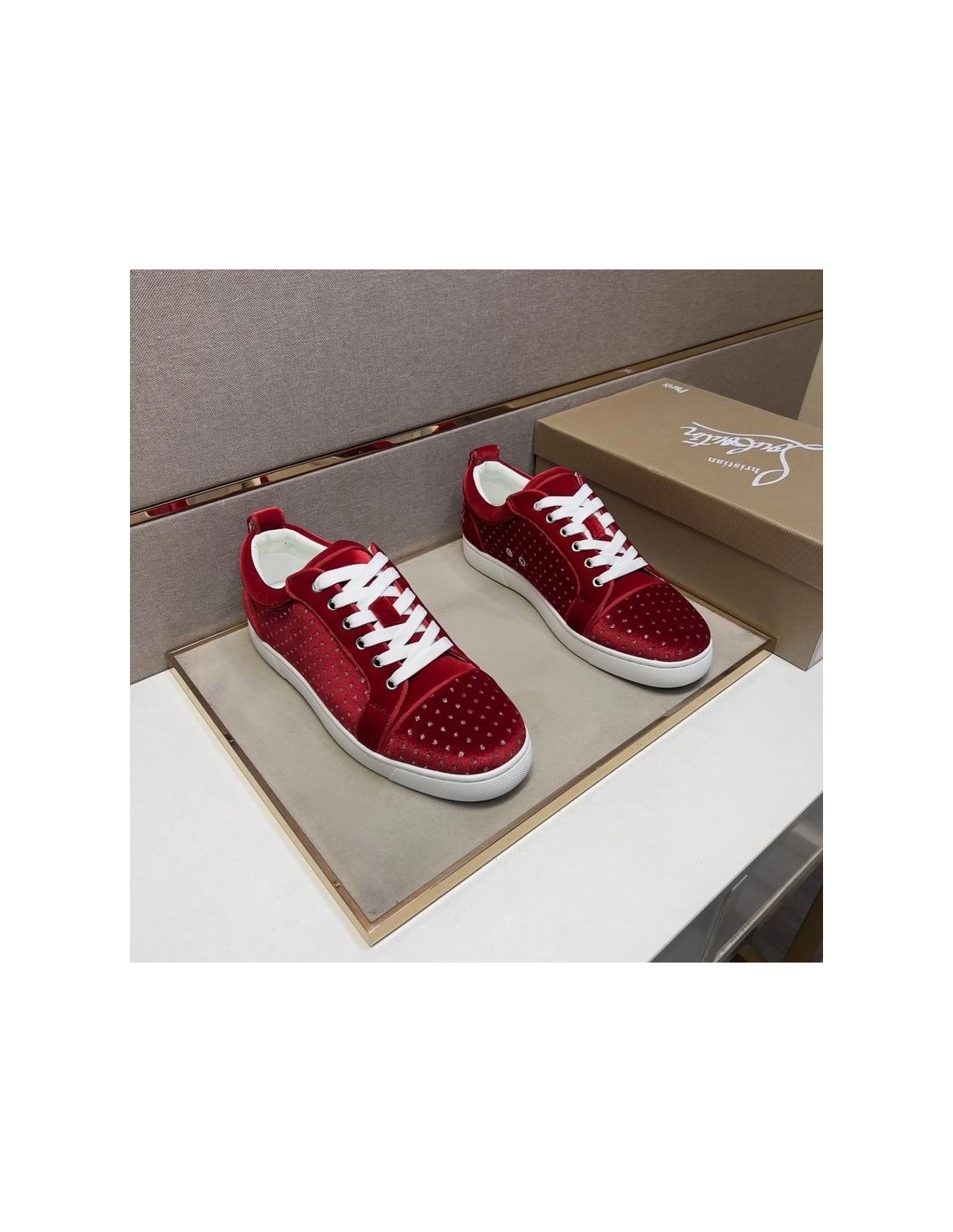 Christian Louboutin Fun Louis Junior Men Low-top Sneakers Veau Velours with Strass Red