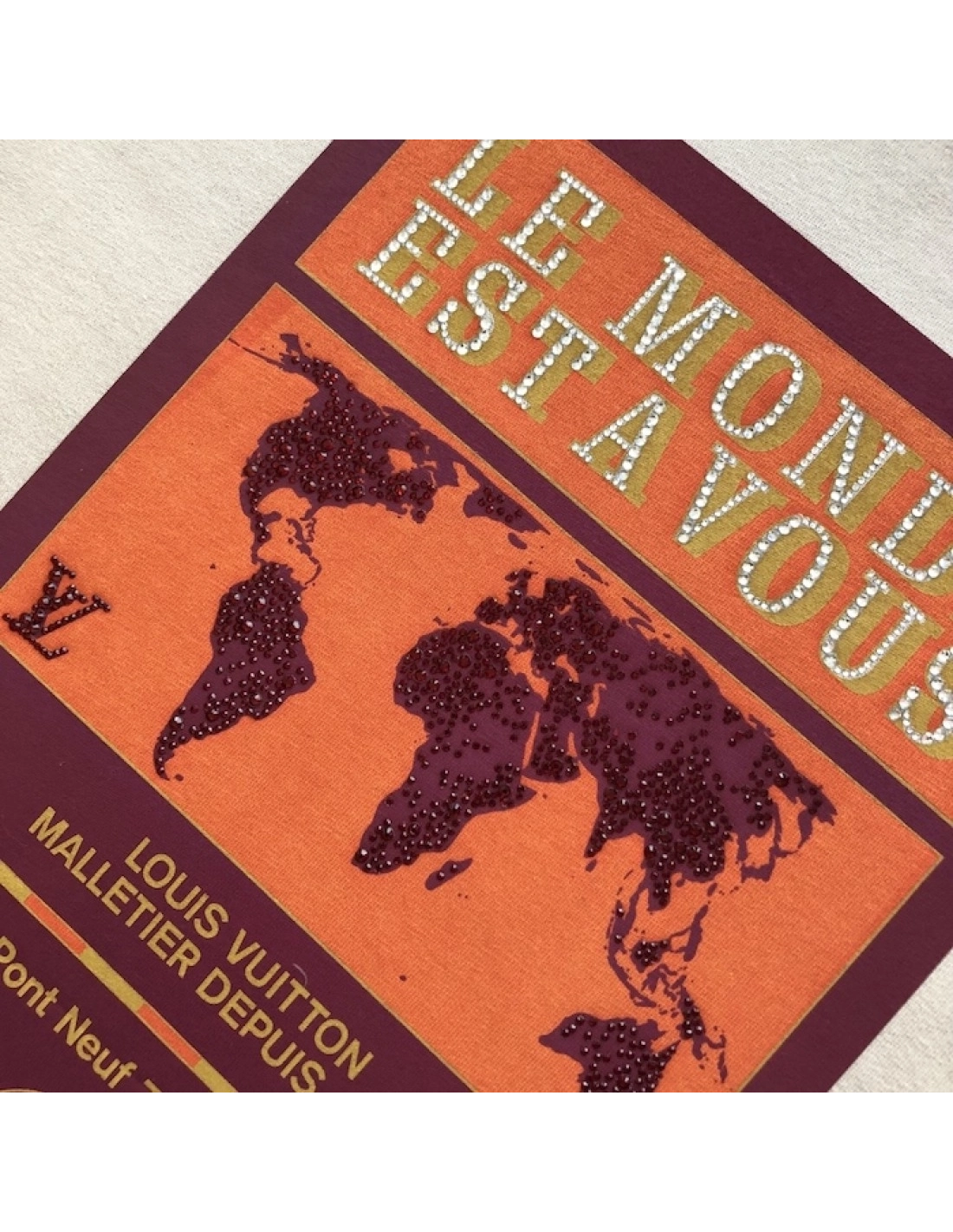 This graphic t-shirt is from the Spring-Summer 2025 show. The washed ivory cotton is adorned with a printed world map motif in warm brown and orange tones featuring the inspirational slogan: 'Le Monde Est ? Vous', while a travel-themed LV signature adorns the back. Rhinestone crystals adorn the front, lending a sophisticated accent to this casual piece.